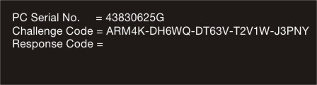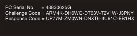 Switch on the notebook, when the boot logo appears press [F2]. “Password=”will be displayed Press keys in the order [CTRL], [TAB], [CTRL] and [ENTER]. The Serial number and Challenge code will be displayed For some reasons it could happen that no PC Serial No. and Challenge Code will be displayed instead of “Not Certified” appears. In this case, remove the AC-adapter and the battery for a short time and try it again. You will receive the “Response code”.Enter the Response code (do not mix up “0” and “O” or “C” and “G” or “8” and “B”)